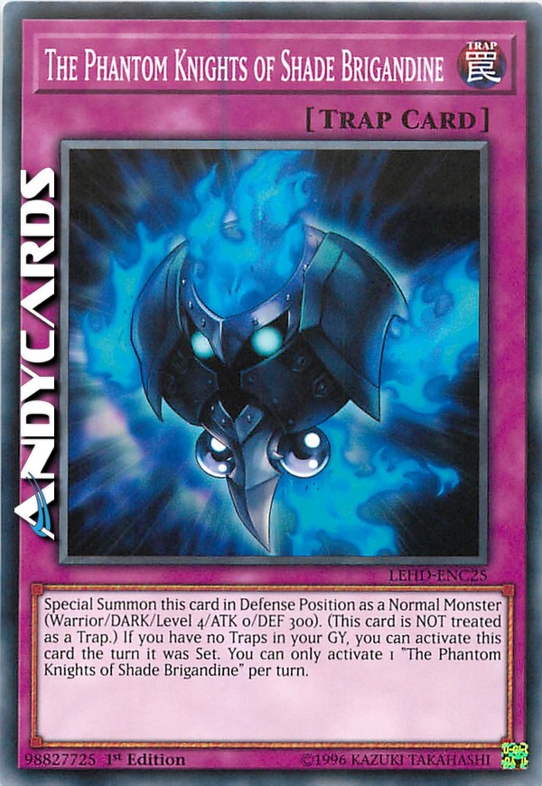 Special Summon this card in Defense Position as a Normal Monster (Warrior/DARK/Level 4/ATK 0/DEF 300). (This card is NOT treated as a Trap.) If you have no Traps in your GY, you can activate this card the turn it was Set. You can only activate 1 "The Phantom Knights of Shade Brigandine" per turn.