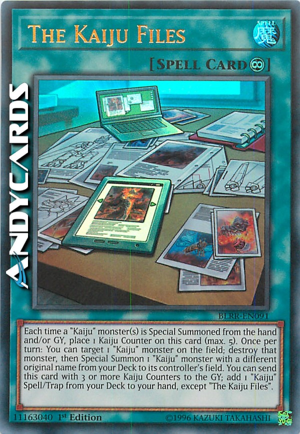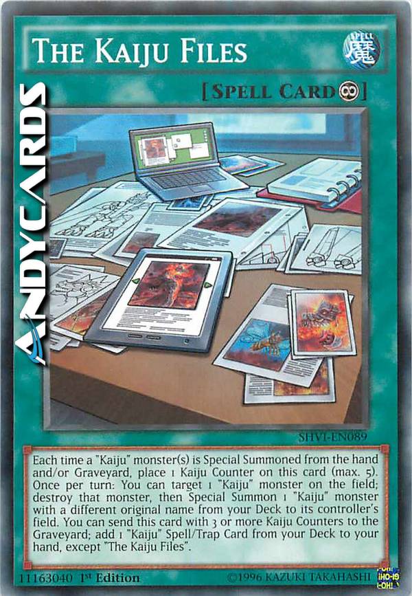 Ogni volta che uno o più mostri "Kaiju" vengono Evocati Specialmente dalla mano e/o Cimitero, metti 1 Segnalino Kaiju su questa carta (massimo 5). Una volta per turno: puoi scegliere come bersaglio 1 mostro "Kaiju" sul Terreno; distruggi quel mostro, poi Evoca Specialmente 1 mostro "Kaiju" con un nome originale diverso dal tuo Deck sul Terreno del suo controllore. Puoi mandare questa carta con 3 o più Segnalini Kaiju al Cimitero; aggiungi 1 Carta Magia/Trappola "Kaiju" dal tuo Deck alla tua mano, eccetto "I Kaiju Files".