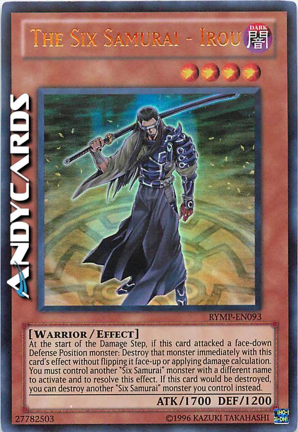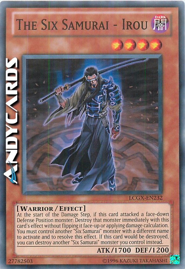 At the start of the Damage Step, if this card attacked a face-down Defense Position monster: Destroy that monster. You must control a face-up "Six Samurai" monster with a different name to activate and to resolve this effect. If this card would be destroyed, you can destroy another face-up "Six Samurai" monster you control instead.