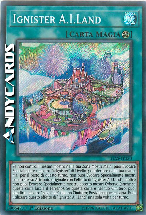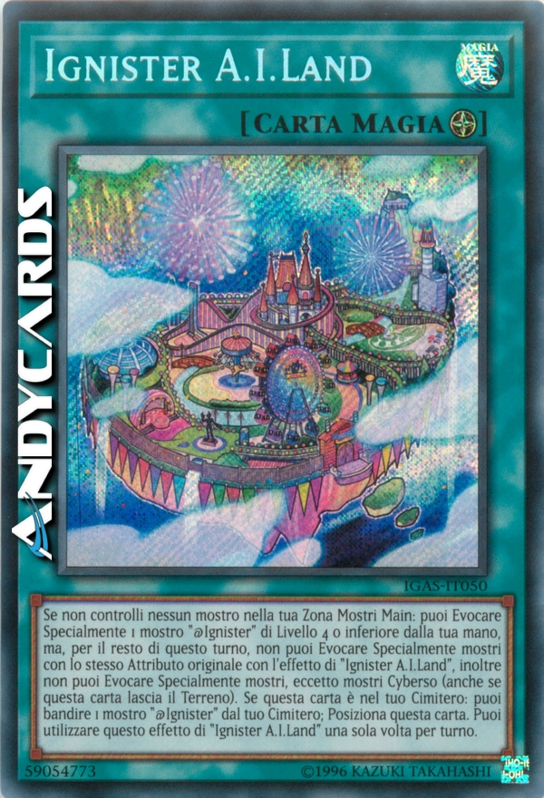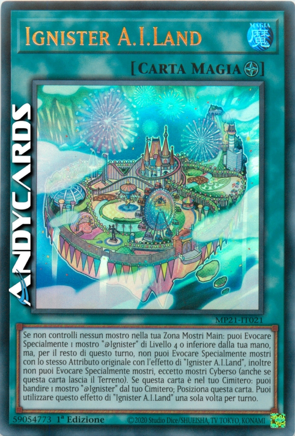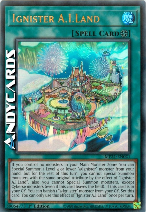 Se non controlli nessun mostro nella tua Zona Mostri Main: puoi Evocare Specialmente 1 mostro "@Ignister" di Livello 4 o inferiore dalla tua mano, ma, per il resto di questo turno, non puoi Evocare Specialmente mostri con lo stesso Attributo originale con l'effetto di "Ignister A.I.Land", inoltre non puoi Evocare Specialmente mostri, eccetto mostri Cyberso (anche se questa carta lascia il Terreno). Se questa carta è nel tuo Cimitero: puoi bandire 1 mostro "@Ignister" dal tuo Cimitero; Posiziona questa carta. Puoi utilizzare questo effetto di "Ignister A.I.Land" una sola volta per turno.