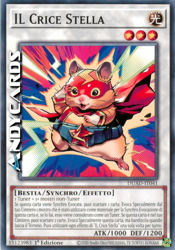 Se questa carta viene Synchro Evocata: puoi scartare 1 carta; Evoca Specialmente dal tuo Cimitero 1 mostro che è stato utilizzato come materiale per la Synchro Evocazione di questa carta e, se lo fai, esso viene considerato come un Tuner. Se questa carta è nel tuo Cimitero: puoi scartare 2 carte; Evoca Specialmente questa carta, ma bandiscila quando lascia il Terreno. Puoi utilizzare ogni effetto di "IL Crice Stella" una sola volta per turno.