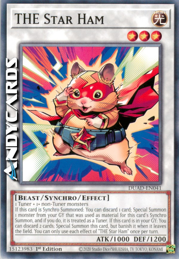 If this card is Synchro Summoned: You can discard 1 card; Special Summon 1 monster from your GY that was used as material for this card's Synchro Summon, and if you do, it is treated as a Tuner. If this card is in your GY: You can discard 2 cards; Special Summon this card, but banish it when it leaves the field. You can only use each effect of "THE Star Ham" once per turn.