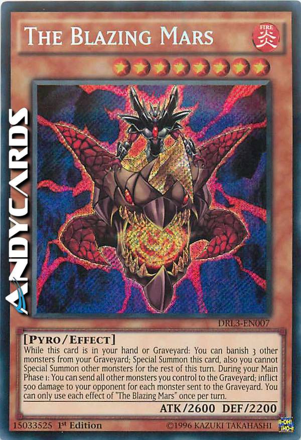 Mentre questa carta è nella tua mano o Cimitero: puoi bandire 3 altri mostri dal tuo Cimitero; Evoca Specialmente questa carta, inoltre non puoi Evocare Specialmente altri mostri per il resto di questo turno. Durante la tua Main Phase 1: puoi mandare tutti gli altri mostri che controlli al Cimitero; infliggi 500 danni al tuo avversario per ogni mostro mandato al Cimitero. Puoi utilizzare questo effetto di "Il Fiammeggiante Marte" una sola volta per turno.