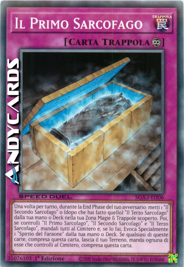 Una volta per turno, durante la End Phase del tuo avversario: metti 1 "Il Secondo Sarcofago" o (dopo che hai fatto quello) "Il Terzo Sarcofago" dalla tua mano o Deck nella tua Zona Magie & Trappole scoperto. Poi, se controlli "Il Primo Sarcofago", "Il Secondo Sarcofago" e "Il Terzo Sarcofago", mandali tutti al Cimitero e, se lo fai, Evoca Specialmente 1 "Spirito del Faraone" dalla tua mano o Deck. Se qualsiasi di queste carte, compresa questa carta, lascia il tuo Terreno, manda ognuna di esse che controlli al Cimitero, compresa questa carta.