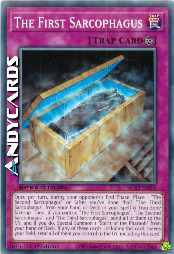 Once per turn, during your opponent's End Phase: Place 1 "The Second Sarcophagus" or (after you've done that) "The Third Sarcophagus" from your hand or Deck in your Spell & Trap Zone face-up. Then, if you control "The First Sarcophagus", "The Second Sarcophagus", and "The Third Sarcophagus", send all of them to the GY, and if you do, Special Summon 1 "Spirit of the Pharaoh" from your hand or Deck. If any of these cards, including this card, leaves your field, send all of them you control to the GY, including this card.
