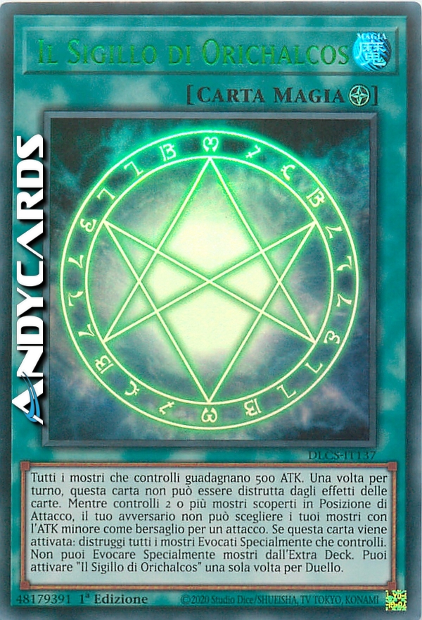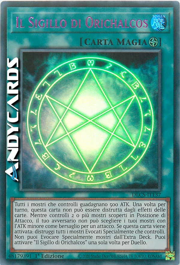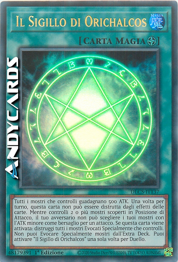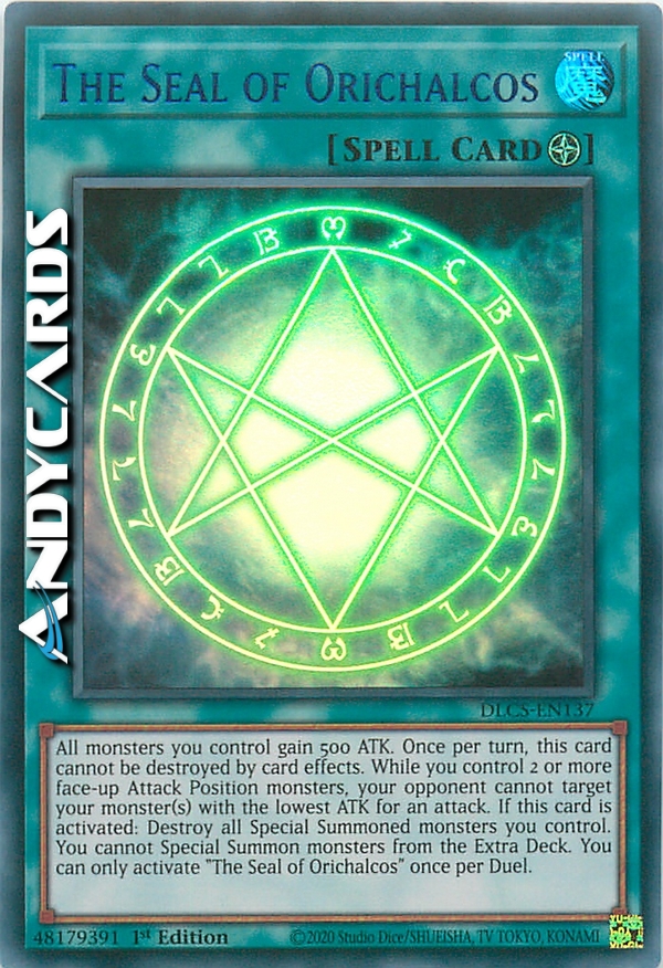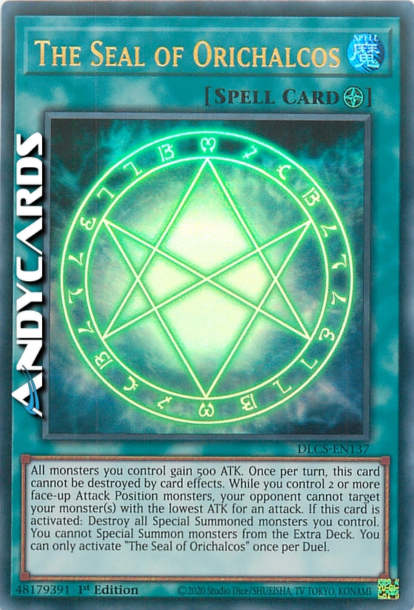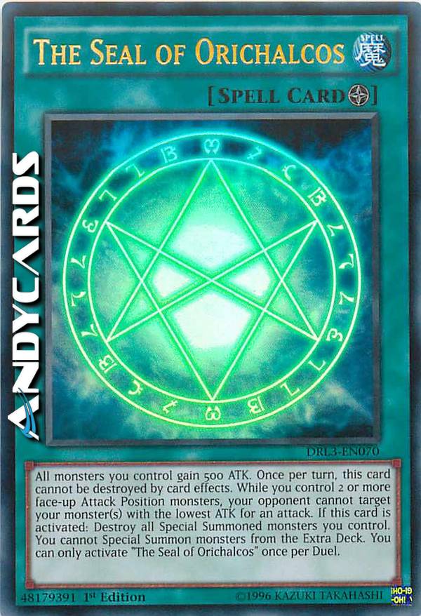Tutti i mostri che controlli guadagnano 500 ATK. Una volta per turno, questa carta non può essere distrutta dagli effetti delle carte. Mentre controlli 2 o più mostri scoperti in Posizione di Attacco, il tuo avversario non può scegliere i tuoi mostri con l'ATK minore come bersaglio per un attacco. Quando questa carta viene attivata: distruggi tutti i mostri Evocati Specialmente che controlli. Non puoi Evocare Specialmente mostri dal tuo Extra Deck. Puoi attivare "Il Sigillo di Orichalcos" una sola volta per Duello.