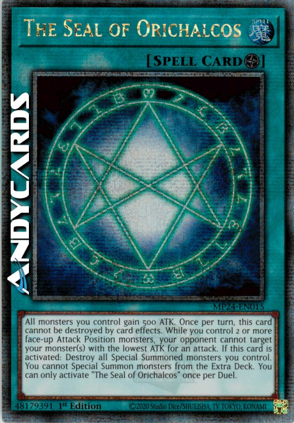 All monsters you control gain 500 ATK. Once per turn, this card cannot be destroyed by card effects. While you control 2 or more face-up Attack Position monsters, your opponent cannot target monster(s) with the lowest ATK for an attack. When this card is activated: Destroy all Special Summoned monsters you control. You cannot Special Summon monsters from your Extra Deck. You can only activate "The Seal of Orichalcos" once per Duel.