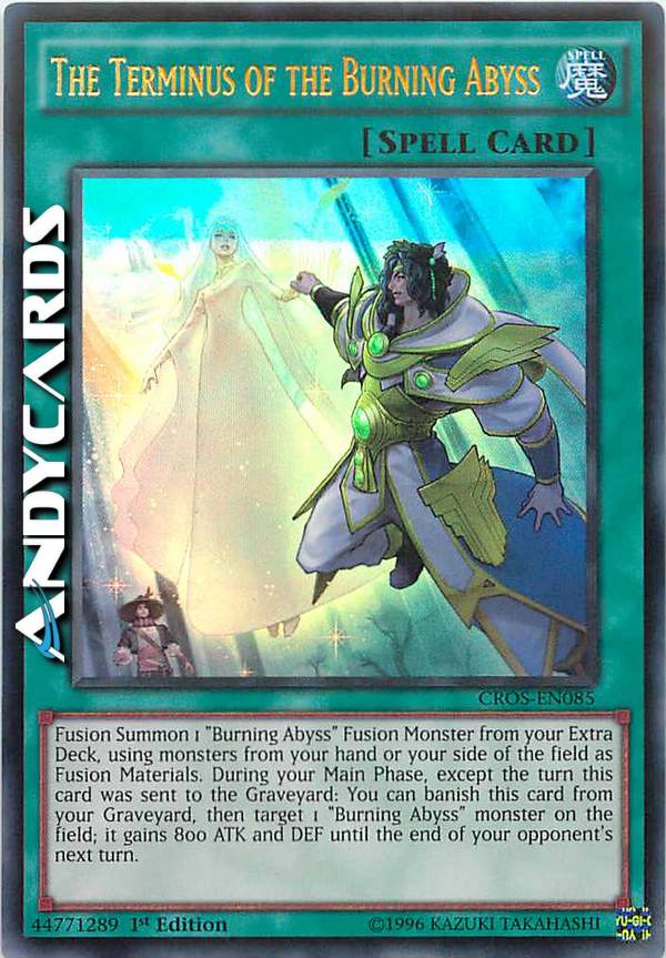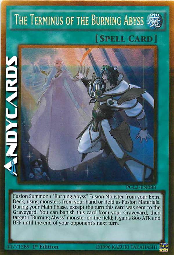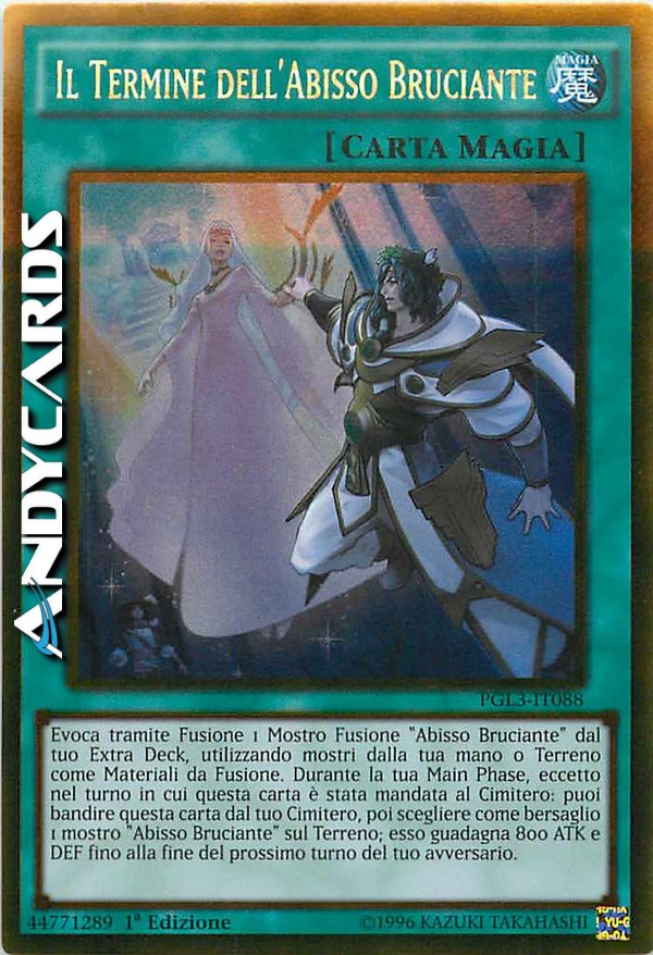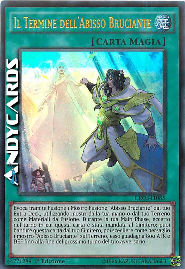 Evoca tramite Fusione 1 Mostro Fusione "Abisso Bruciante" dal tuo Extra Deck, utilizzando mostri dalla tua mano o dal tuo Terreno come Materiali da Fusione. Durante la tua Main Phase, eccetto nel turno in cui questa carta è stata mandata al Cimitero: puoi bandire questa carta dal tuo Cimitero, poi scegliere come bersaglio 1 mostro "Abisso Bruciante" sul Terreno; esso guadagna 800 ATK e DEF fino alla fine del prossimo turno del tuo avversario.
