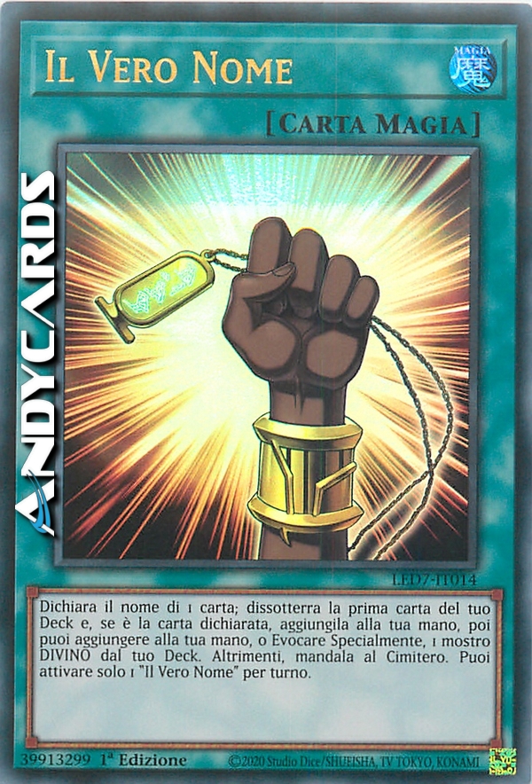 Dichiara il nome di 1 carta; dissotterra la prima carta del tuo Deck e, se è la carta dichiarata, aggiungila alla tua mano, poi puoi aggiungere alla tua mano, o Evocare Specialmente, 1 mostro DIVINO dal tuo Deck. Altrimenti, mandala al Cimitero. Puoi attivare solo 1 "Il Vero Nome" per turno.