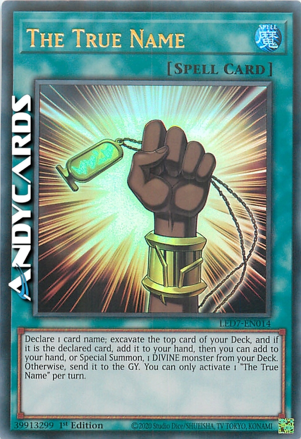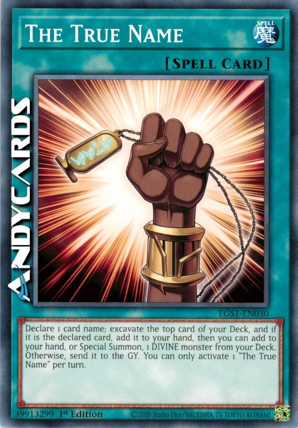 Declare 1 card name; excavate the top card of your Deck, and if it is the declared card, add it to your hand, then you can add to your hand, or Special Summon, 1 DIVINE monster from your Deck. Otherwise, send it to the GY. You can only activate 1 "The True Name" per turn.