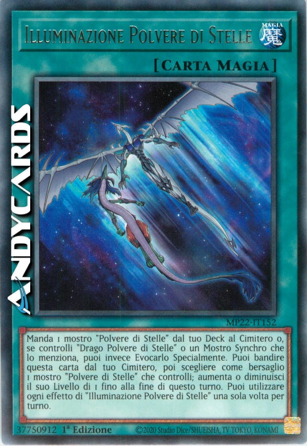 Manda 1 mostro "Polvere di Stelle" dal tuo Deck al Cimitero o, se controlli "Drago Polvere di Stelle" o un Mostro Synchro che indica "Drago Polvere di Stelle" nel suo testo, puoi invece Evocarlo Specialmente. Puoi bandire questa carta dal tuo Cimitero, poi scegliere come bersaglio 1 mostro "Polvere di Stelle" che controlli; aumenta o diminuisci il suo Livello di 1 fino alla fine di questo turno. Puoi utilizzare ogni effetto di "Illuminazione Polvere di Stelle" una sola volta per turno.