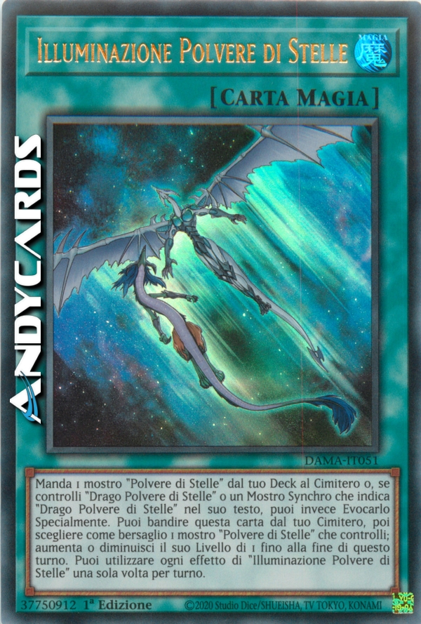 Manda 1 mostro "Polvere di Stelle" dal tuo Deck al Cimitero o, se controlli "Drago Polvere di Stelle" o un Mostro Synchro che indica "Drago Polvere di Stelle" nel suo testo, puoi invece Evocarlo Specialmente. Puoi bandire questa carta dal tuo Cimitero, poi scegliere come bersaglio 1 mostro "Polvere di Stelle" che controlli; aumenta o diminuisci il suo Livello di 1 fino alla fine di questo turno. Puoi utilizzare ogni effetto di "Illuminazione Polvere di Stelle" una sola volta per turno.
