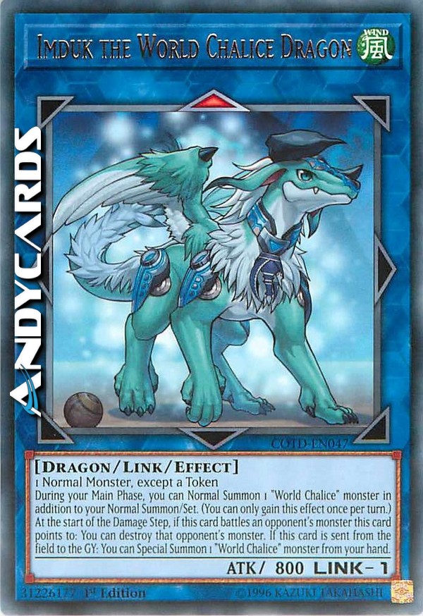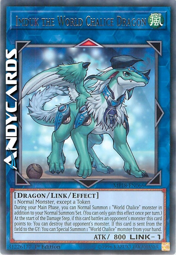 1 Normal Monster, except a Token - During your Main Phase, you can Normal Summon 1 "World Chalice" monster in addition to your Normal Summon/Set. (You can only gain this effect once per turn.) At the start of the Damage Step, if this card battles an opponent's monster this card points to: You can destroy that opponent's monster. If this card is sent from the field to the GY: You can Special Summon 1 "World Chalice" monster from your hand.