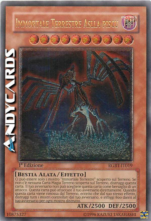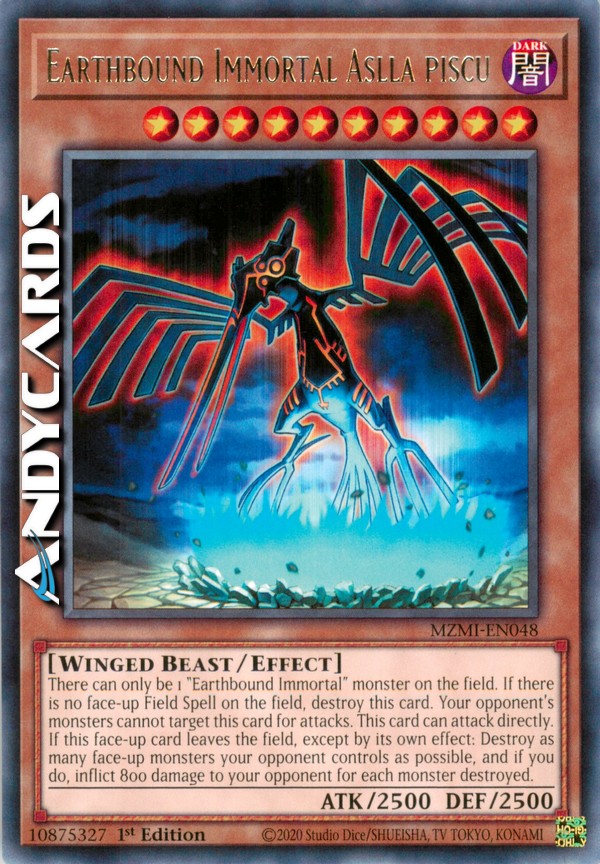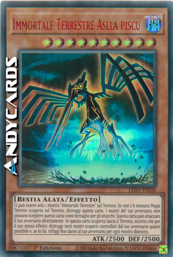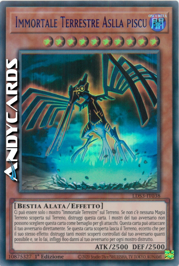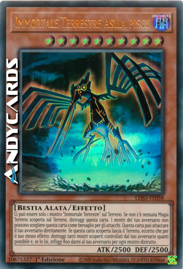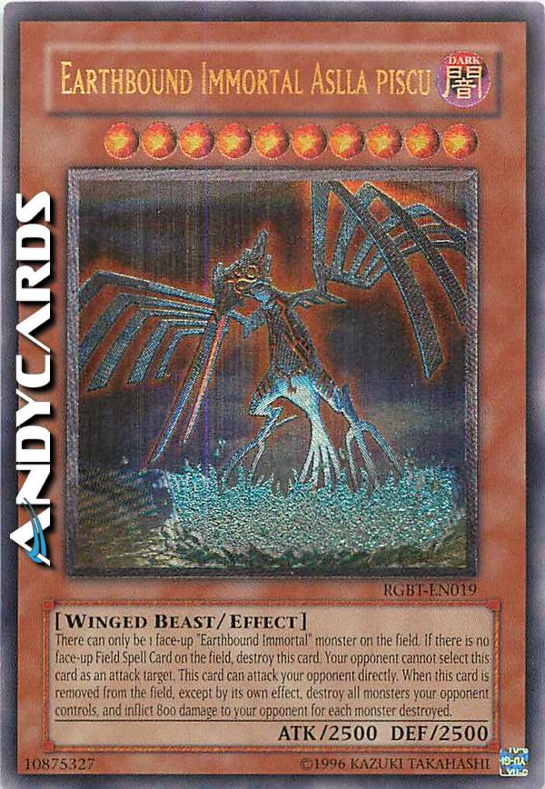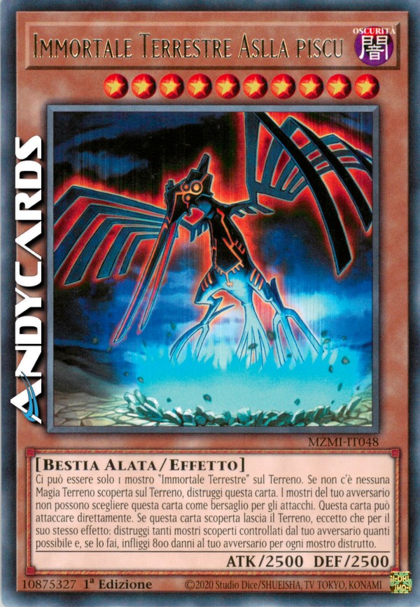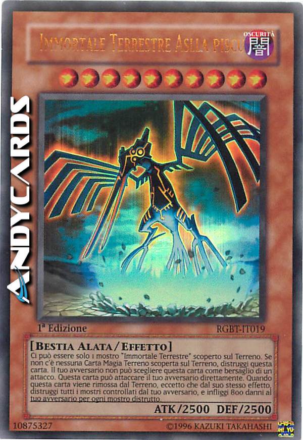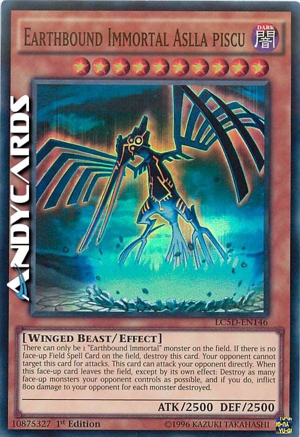 Ci può essere solo 1 mostro "Immortale Terrestre" sul Terreno. Se non c'è nessuna Carta Magia Terreno scoperta sul Terreno, distruggi questa carta. Il tuo avversario non può scegliere questa carta come bersaglio per gli attacchi. Questa carta può attaccare il tuo avversario direttamente. Quando questa carta scoperta lascia il Terreno, eccetto che per il suo stesso effetto: distruggi tanti mostri scoperti controllati dal tuo avversario quanti possibile e, se lo fai, infliggi 800 danni al tuo avversario per ogni mostro distrutto.