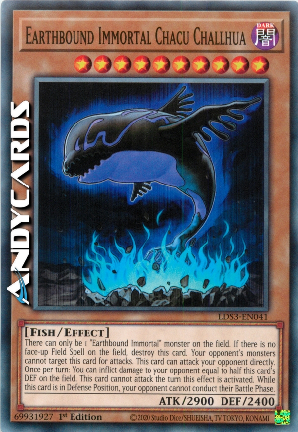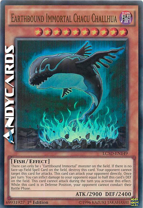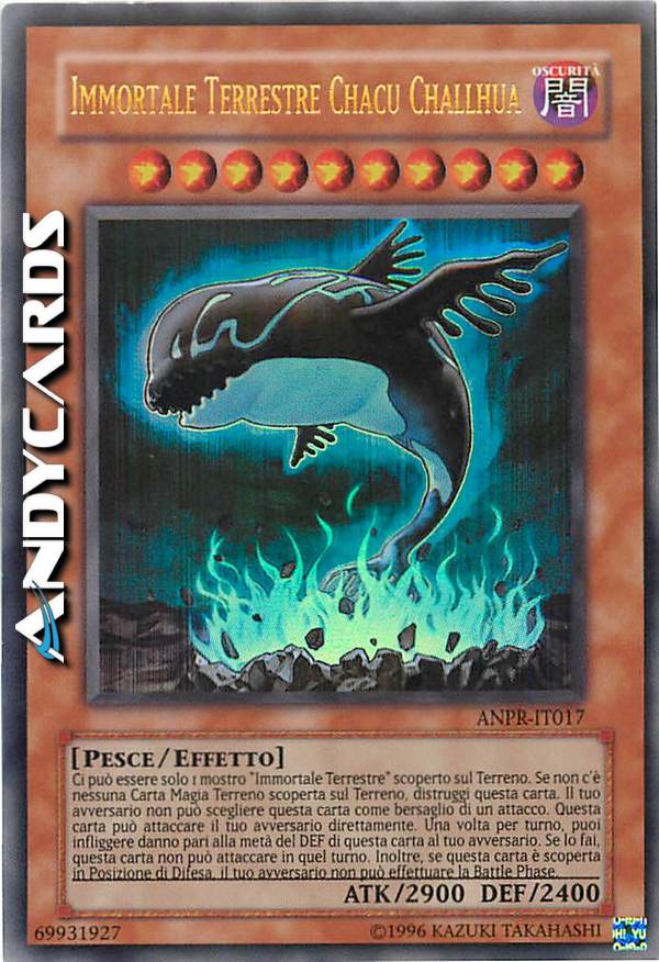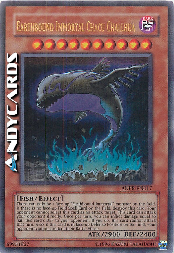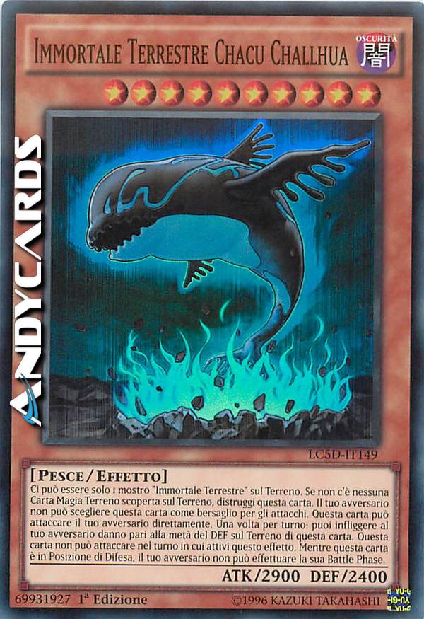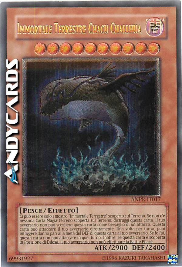 Ci può essere solo 1 mostro "Immortale Terrestre" sul Terreno. Se non c'è nessuna Carta Magia Terreno scoperta sul Terreno, distruggi questa carta. Il tuo avversario non può scegliere questa carta come bersaglio per gli attacchi. Questa carta può attaccare il tuo avversario direttamente. Una volta per turno: puoi infliggere al tuo avversario danno pari alla metà del DEF sul Terreno di questa carta. Questa carta non può attaccare nel turno in cui attivi questo effetto. Mentre questa carta è in Posizione di Difesa, il tuo avversario non può effettuare la sua Battle Phase.