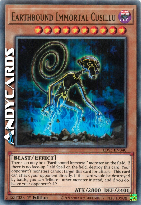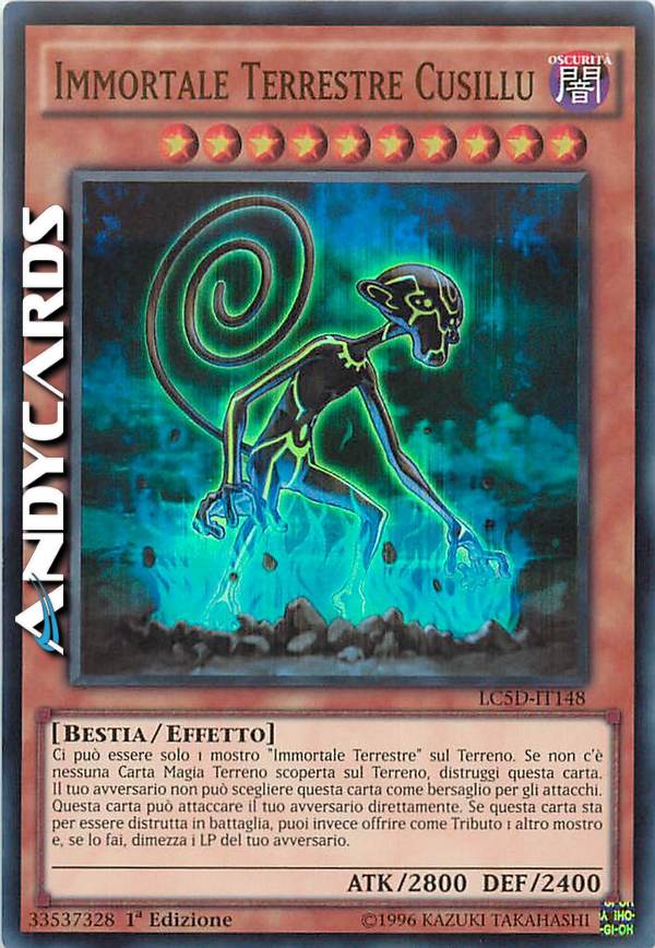 Ci può essere solo 1 mostro "Immortale Terrestre" scoperto sul Terreno. Se non c'è nessuno Carta Magia Terreno scoperta sul Terreno, distruggi questa carta. Il tuo avversario non può scegliere questa carta come bersaglio di un attacco. Questa carta può attaccare il tuo avversario direttamente. Se questa carta scoperta che controlli sta per essere distrutta in battaglia, puoi invece offrire come Tributo 1 altro mostro che controlli e dimezzare i Life Points del tuo avversario.