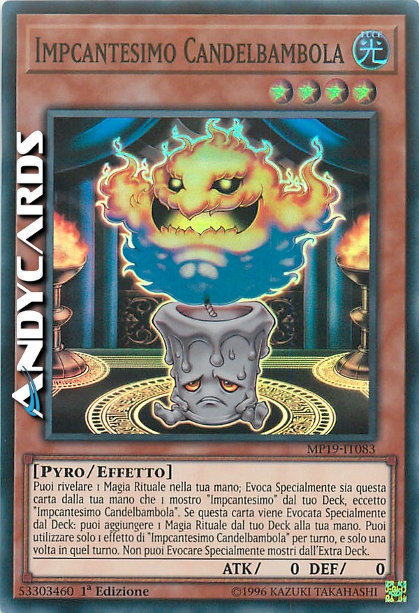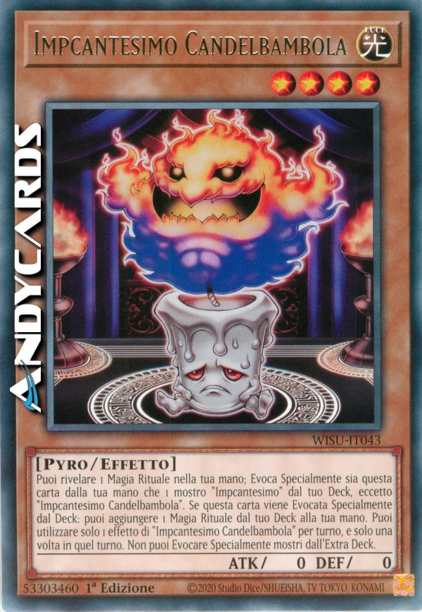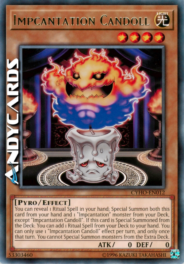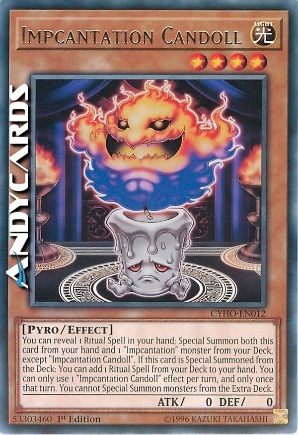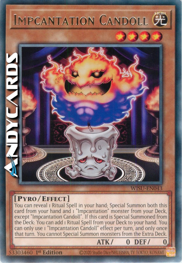 Puoi rivelare 1 Magia Rituale nella tua mano; Evoca Specialmente sia questa carta dalla tua mano che 1 mostro "Impcantesimo" dal tuo Deck, eccetto "Impcantesimo Candelbambola". Se questa carta viene Evocata Specialmente dal Deck: puoi aggiungere 1 Magia Rituale dal tuo Deck alla tua mano. Puoi utilizzare solo 1 effetto di "Impcantesimo Candelbambola" per turno, e solo una volta in quel turno. Non puoi Evocare Specialmente mostri dall'Extra Deck.