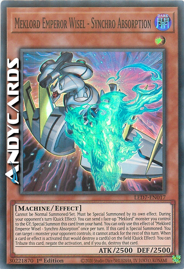 Non può essere Evocato Normalmente/Posizionato. Deve essere Evocato Specialmente dal suo stesso effetto. Durante il turno del tuo avversario (Effetto Rapido): puoi mandare 1 mostro "Meklord" scoperto che controlli al Cimitero; Evoca Specialmente questa carta dalla tua mano. Puoi utilizzare questo effetto di "Imperatore Meklord Wisel - Synchro Assorbimento" una sola volta per turno. Se questa carta viene Evocata Specialmente: puoi scegliere come bersaglio 1 mostro controllato dal tuo avversario; esso non può attaccare per il resto di questo turno. Quando viene attivata una carta o un effetto che sta per distruggere una o più carte sul Terreno (Effetto Rapido): puoi offrire come Tributo questa carta; annulla l'attivazione e, se lo fai, distruggi quella carta.