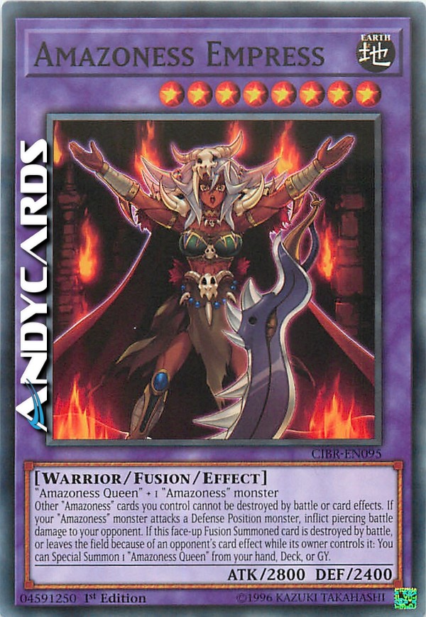 Regina Amazoness + 1 mostro "Amazoness" - Le altre carte "Amazoness" che controlli non possono essere distrutte in battaglia o dagli effetti delle carte. Se un tuo mostro "Amazoness" attacca un mostro in Posizione di Difesa, infliggi danno da combattimento perforante al tuo avversario. Se questa carta scoperta Evocata tramite Fusione viene distrutta in battaglia o lascia il Terreno a causa dell'effetto di una carta dell'avversario mentre è controllata dal suo proprietario: puoi Evocare Specialmente 1 "Regina Amazoness" dalla tua mano, Deck o Cimitero.