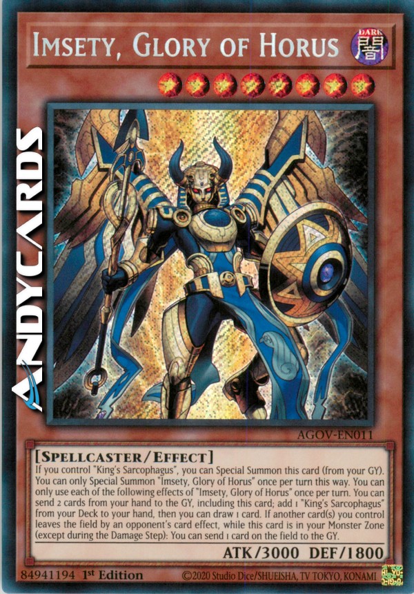 If you control "King's Sarcophagus", you can Special Summon this card (from your GY). You can only Special Summon "Imsety, Glory of Horus" once per turn this way. You can only use each of the following effects of "Imsety, Glory of Horus" once per turn. You can send 2 cards from your hand to the GY, including this card; add 1 "King's Sarcophagus" from your Deck to your hand, then you can draw 1 card. If another card(s) you control leaves the field by an opponent's card effect, while this card is in your Monster Zone (except during the Damage Step): You can send 1 card on the field to the GY.