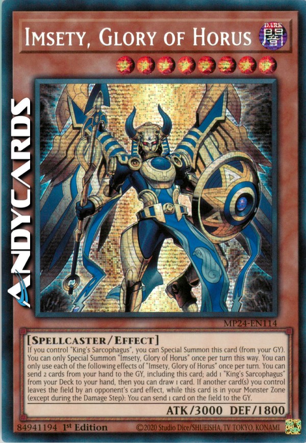 Se controlli "Sarcofago del Re", puoi Evocare Specialmente questa carta (dal tuo Cimitero). Puoi Evocare Specialmente "Imsety, Gloria di Horus" una sola volta per turno in questo modo. Puoi utilizzare ognuno dei seguenti effetti di "Imsety, Gloria di Horus" una sola volta per turno. Puoi mandare 2 carte dalla tua mano al Cimitero, compresa questa carta; aggiungi 1 "Sarcofago del Re" dal tuo Deck alla tua mano, poi puoi pescare 1 carta. Se una o più altre carte che controlli lasciano il Terreno per l'effetto di una carta dell'avversario mentre questa carta è nella tua Zona Mostri (eccetto durante il Damage Step): puoi mandare al Cimitero 1 carta sul Terreno.