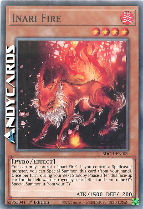 You can only control 1 "Inari Fire". If you control a Spellcaster monster, you can Special Summon this card (from your hand). Once per turn, during your next Standby Phase after this face-up card on the field was destroyed by card effect and sent to the GY: Special Summon it from your GY.