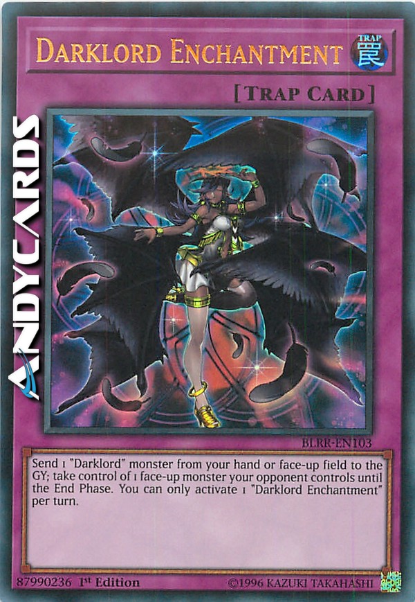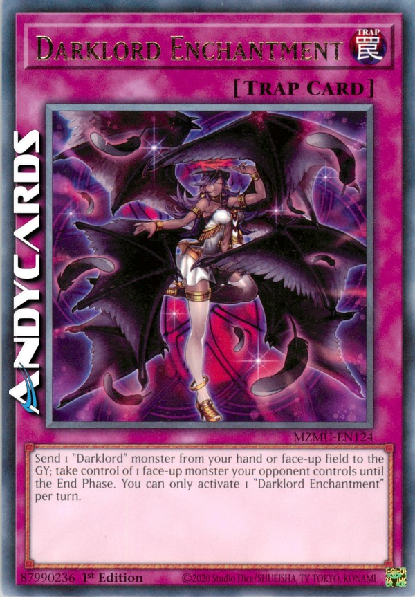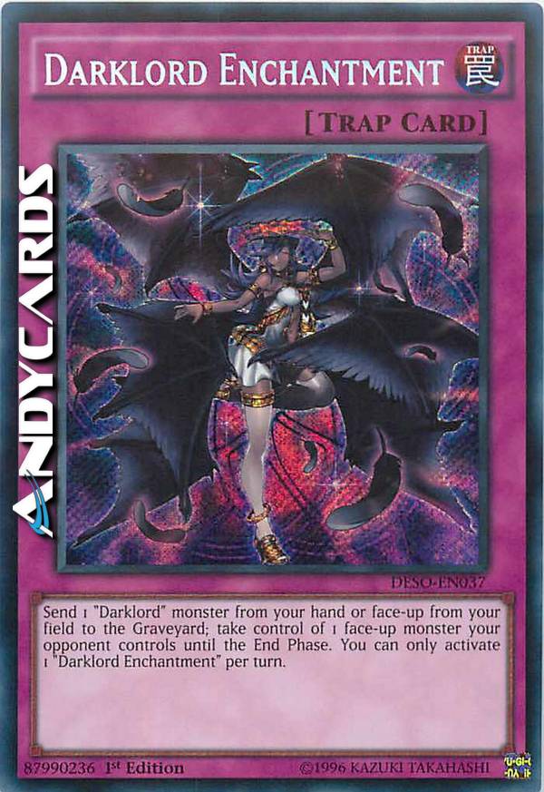 Send 1 "Darklord" monster from your hand or face-up field to the GY; take control of 1 face-up monster your opponent controls until the End Phase. You can only activate 1 "Darklord Enchantment" per turn.