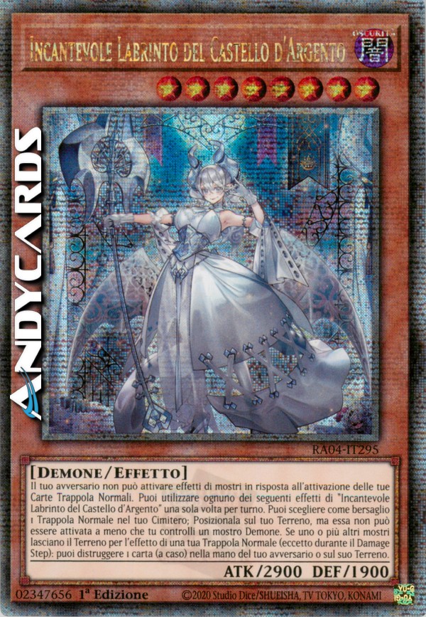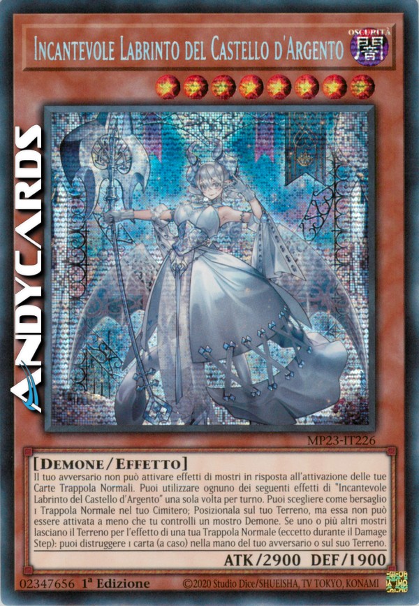 Il tuo avversario non può attivare effetti di mostri in risposta all'attivazione delle tue Carte Trappola Normali. Puoi utilizzare ognuno dei seguenti effetti di "Incantevole Labrinto del Castello d'Argento" una sola volta per turno. Puoi scegliere come bersaglio 1 Trappola Normale nel tuo Cimitero; Posizionala sul tuo Terreno, ma essa non può essere attivata a meno che tu controlli un mostro Demone. Se uno o più altri mostri lasciano il Terreno per l'effetto di una tua Trappola Normale (eccetto durante il Damage Step): puoi distruggere 1 carta (a caso) nella mano del tuo avversario o sul suo Terreno.