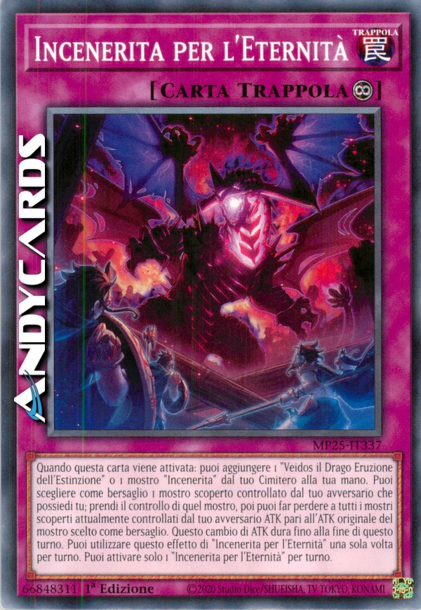 Quando questa carta viene attivata: puoi aggiungere 1 "Veidos il Drago Eruzione dell'Estinzione" o 1 mostro "Incenerita" dal tuo Cimitero alla tua mano. Puoi scegliere come bersaglio 1 mostro scoperto controllato dal tuo avversario che possiedi tu; prendi il controllo di quel mostro, poi puoi far perdere a tutti i mostri scoperti attualmente controllati dal tuo avversario ATK pari all'ATK originale del mostro scelto come bersaglio. Questo cambio di ATK dura fino alla fine di questo turno. Puoi utilizzare questo effetto di "Incenerita per l'Eternità" una sola volta per turno. Puoi attivare solo 1 "Incenerita per l'Eternità" per turno.