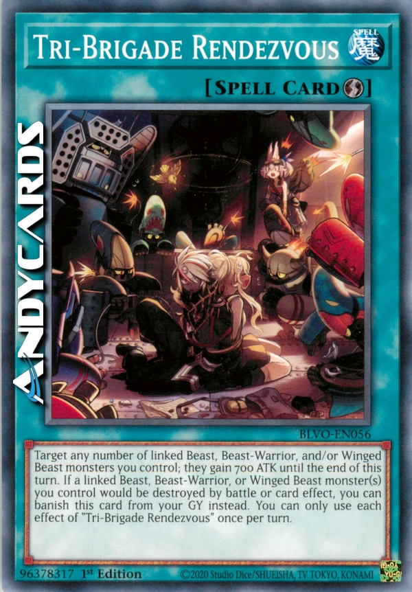 Target any number of linked Beast, Beast-Warrior, and/or Winged Beast monsters you control; they gain 700 ATK until the end of this turn. If a linked Beast, Beast-Warrior, or Winged Beast monster(s) you control would be destroyed by battle or card effect, you can banish this card from your GY instead. You can only use each effect of "Tri-Brigade Rendezvous" once per turn.