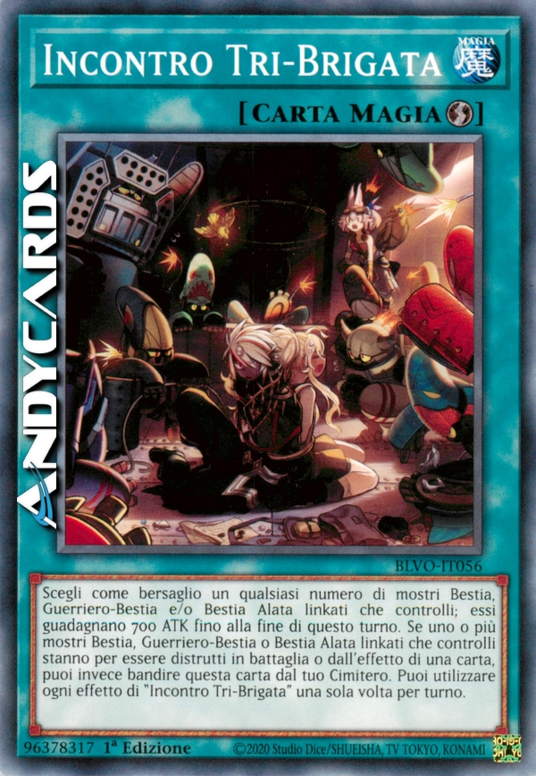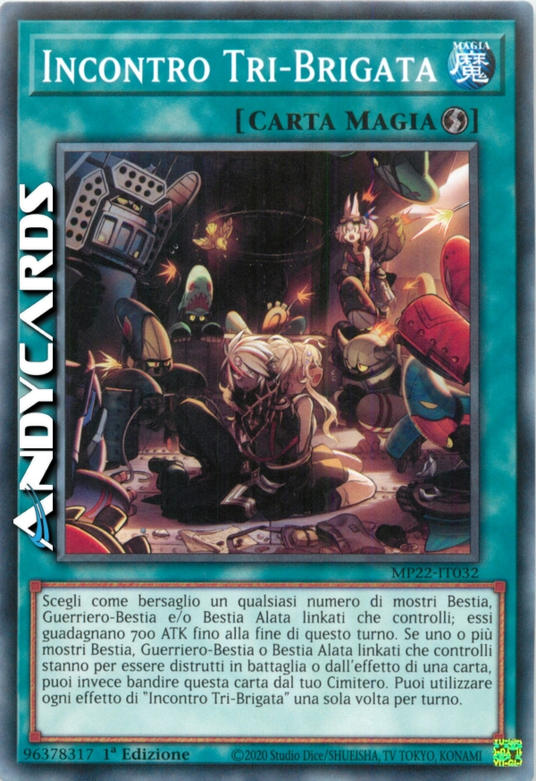Scegli come bersaglio un qualsiasi numero di mostri Bestia, Guerriero-Bestia e/o Bestia Alata linkati che controlli; essi guadagnano 700 ATK fino alla fine di questo turno. Se uno o più mostri Bestia, Guerriero-Bestia o Bestia Alata linkati che controlli stanno per essere distrutti in battaglia o dall'effetto di una carta, puoi invece bandire questa carta dal tuo Cimitero. Puoi utilizzare ogni effetto di "Incontro Tri-Brigata" una sola volta per turno.