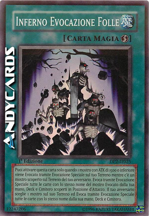 Quando esattamente 1 mostro con ATK di 1500 o inferiore viene Evocato Specialmente sul tuo Terreno mentre il tuo avversario controlla un mostro scoperto: Evoca Specialmente tanti mostri quanti possibile con lo stesso nome del mostro Evocato, dalla tua mano, Deck e Cimitero, in Posizione di Attacco, inoltre il tuo avversario Evoca Specialmente tanti mostri quanti possibile con lo stesso nome di 1 dei suoi mostri scoperti, dalla sua mano, Deck e Cimitero.