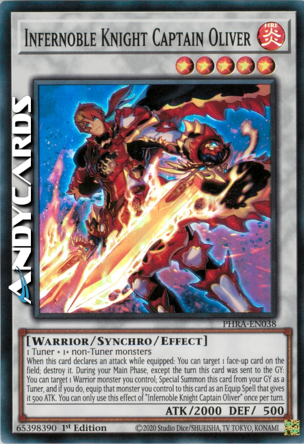 When this card declares an attack while equipped: You can target 1 face-up card on the field; destroy it. During your Main Phase, except the turn this card was sent to the GY: You can target 1 Warrior monster you control; Special Summon this card from your GY as a Tuner, and if you do, equip that monster you control to this card as an Equip Spell that gives it 500 ATK. You can only use this effect of "Infernoble Knight Captain Oliver" once per turn.