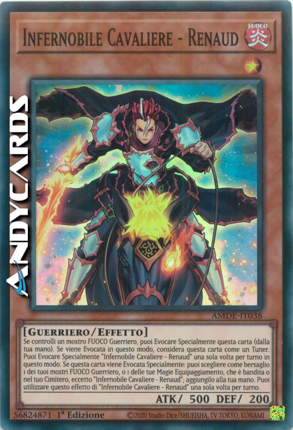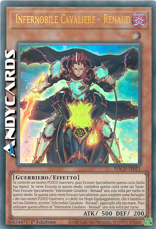 Se controlli un mostro FUOCO Guerriero, puoi Evocare Specialmente questa carta (dalla tua mano). Se viene Evocata in questo modo, considera questa carta come un Tuner. Puoi Evocare Specialmente "Infernobile Cavaliere - Renaud" una sola volta per turno in questo modo. Se questa carta viene Evocata Specialmente: puoi scegliere come bersaglio 1 dei tuoi mostri FUOCO Guerriero, o 1 delle tue Magie Equipaggiamento, che è bandita o nel tuo Cimitero, eccetto "Infernobile Cavaliere - Renaud"; aggiungilo alla tua mano. Puoi utilizzare questo effetto di "Infernobile Cavaliere - Renaud" una sola volta per turno.