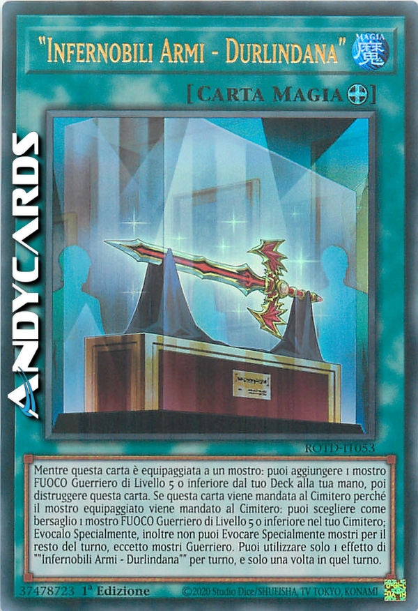 Mentre questa carta è equipaggiata a un mostro: puoi aggiungere 1 mostro FUOCO Guerriero di Livello 5 o inferiore dal tuo Deck alla tua mano, poi distruggere questa carta. Se questa carta viene mandata al Cimitero perché il mostro equipaggiato viene mandato al Cimitero: puoi scegliere come bersaglio 1 mostro FUOCO Guerriero di Livello 5 o inferiore nel tuo Cimitero; Evocalo Specialmente, inoltre non puoi Evocare Specialmente mostri per il resto del turno, eccetto mostri Guerriero. Puoi utilizzare solo 1 effetto di ""Infernobili Armi - Durlindana"" per turno, e solo una volta in quel turno.