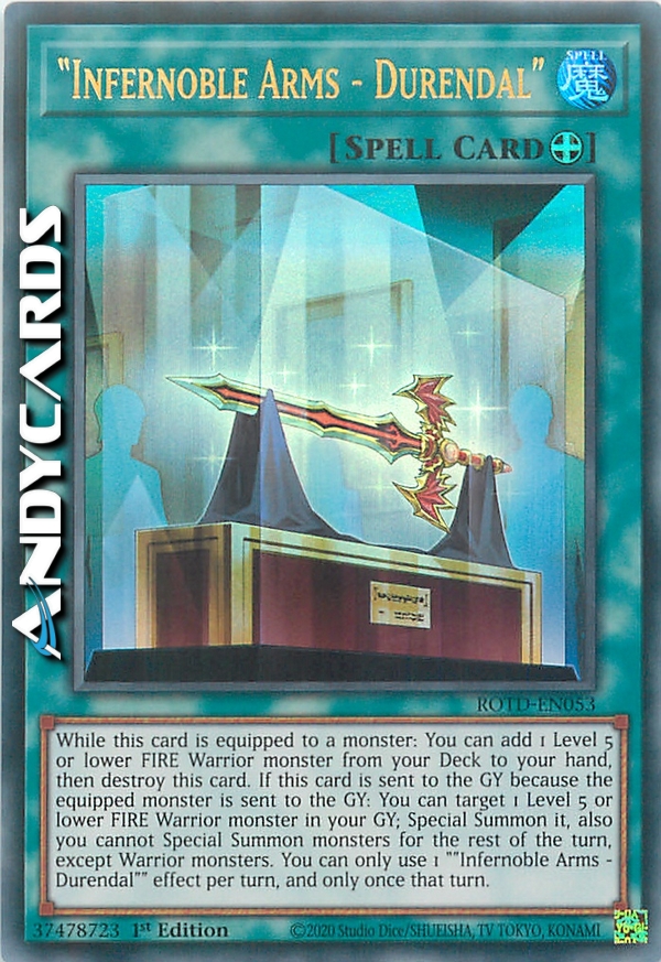 While this card is equipped to a monster: You can add 1 Level 5 or lower FIRE Warrior monster from your Deck to your hand, then destroy this card. If this card is sent to the GY because the equipped monster is sent to the GY: You can target 1 Level 5 or lower FIRE Warrior monster in your GY; Special Summon it, also you cannot Special Summon monsters for the rest of the turn, except Warrior monsters. You can only use 1 ""Infernoble Arms - Durendal"" effect per turn, and only once that turn.