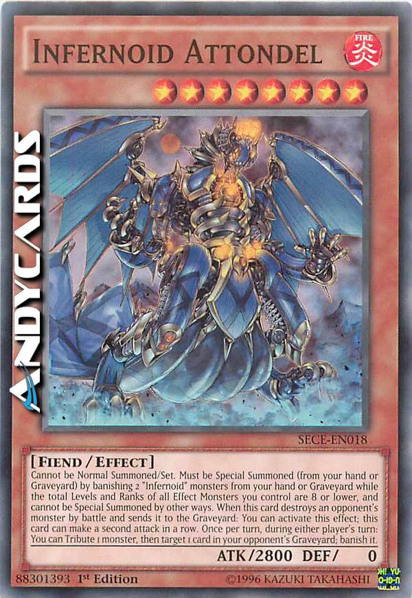 Non può essere Evocato Normalmente/Posizionato. Deve essere Evocato Specialmente (dalla tua mano o Cimitero) bandendo 2 mostri "Infernoid" dalla tua mano o Cimitero mentre la somma dei Livelli e dei Ranghi di tutti i Mostri con Effetto che controlli è pari o inferiore a 8, e non può essere Evocato Specialmente in altri modi. Quando questa carta distrugge un mostro dell'avversario in battaglia e lo manda al Cimitero: puoi attivare questo effetto; questa carta può effettuare un secondo attacco di seguito. Una volta per turno, durante il turno di qualsiasi giocatore: puoi offrire come Tributo 1 mostro, poi scegliere come bersaglio 1 carta nel Cimitero del tuo avversario; bandiscila.