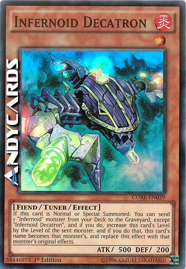 Se questa carta viene Evocata Normalmente o Specialmente: puoi mandare 1 mostro "Infernoid" dal tuo Deck al Cimitero, eccetto "Infernoid Decatron", e, se lo fai, aumenta il Livello di questa carta del Livello del mostro mandato e, se fai quello, il nome di questa carta diventa quello di quel mostro, e sostituisci questo effetto con l'effetto originale di quel mostro.