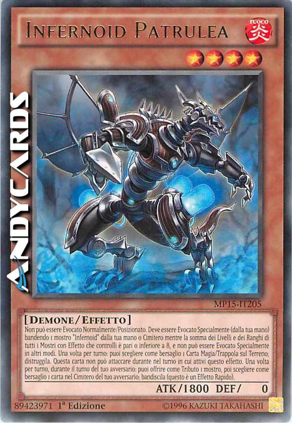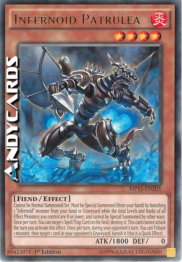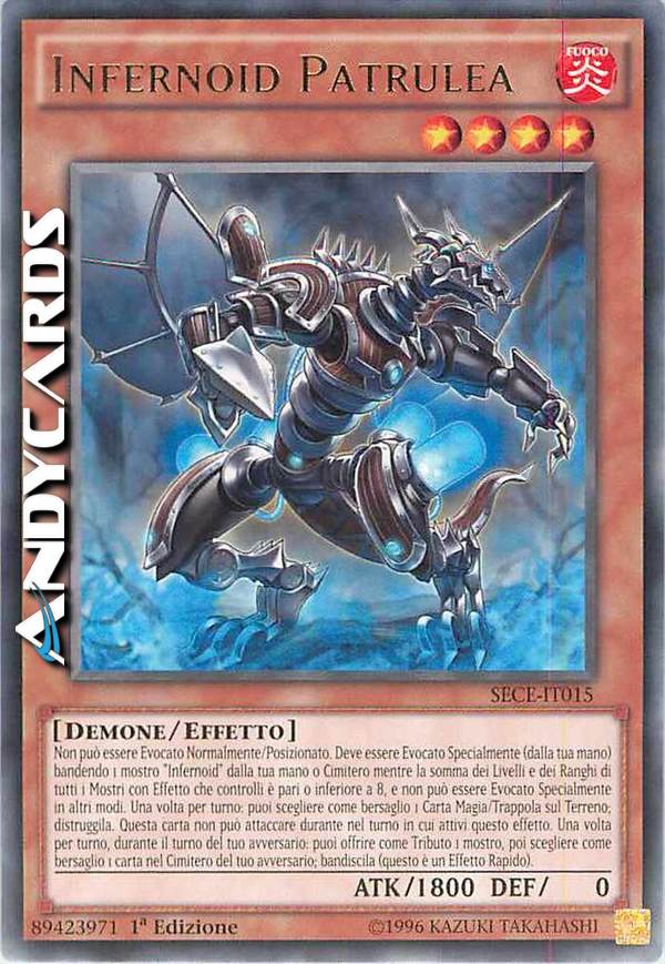 Non può essere Evocato Normalmente/Posizionato. Deve essere Evocato Specialmente (dalla tua mano) bandendo 1 mostro "Infernoid" dalla tua mano o Cimitero mentre la somma dei Livelli e dei Ranghi di tutti i Mostri con Effetto che controlli è pari o inferiore a 8, e non può essere Evocato Specialmente in altri modi. Una volta per turno: puoi scegliere come bersaglio 1 Carta Magia/Trappola sul Terreno; distruggila. Questa carta non può attaccare nel turno in cui attivi questo effetto. Una volta per turno, durante il turno del tuo avversario: puoi offrire come Tributo 1 mostro, poi scegliere come bersaglio 1 carta nel Cimitero del tuo avversario; bandiscila (questo è un Effetto Rapido).