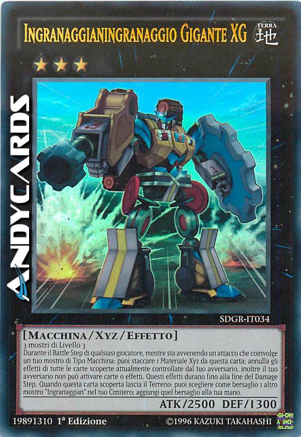 3 mostri di Livello 3 Durante il Battle Step di qualsiasi giocatore, mentre sta avvenendo un attacco che coinvolge un tuo mostro di Tipo Macchina: puoi staccare 1 Materiale Xyz da questa carta; annulla gli effetti di tutte le carte scoperte attualmente controllate dal tuo avversario, inoltre il tuo avversario non può attivare carte o effetti. Questi effetti durano fino alla fine del Damage Step. Quando questa carta scoperta lascia il Terreno: puoi scegliere come bersaglio 1 altro mostro "ingranaggian" nel tuo Cimitero; aggiungi quel bersaglio alla tua mano.