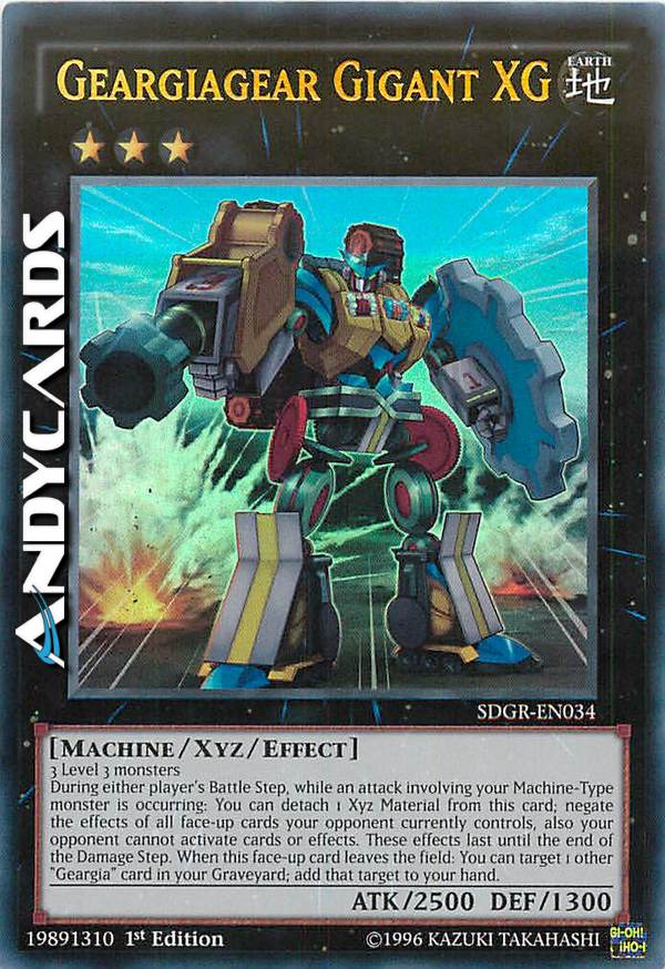 3 Level 3 monster During either player's Battle Step, while an attack involving your Machine-Type monster is occurring: You can detach 1 Xyz Material from this card; negate the effects of all face-up cards your opponent currently controls, also your opponent cannot activate cards or effects. These effects last until the end of the Damage Step. When this face-up card leaves the field: You can target 1 other "Geargia" card in your Graveyard; add that target to your hand.