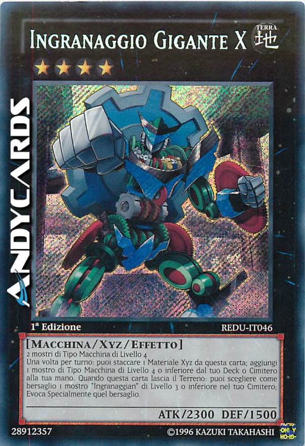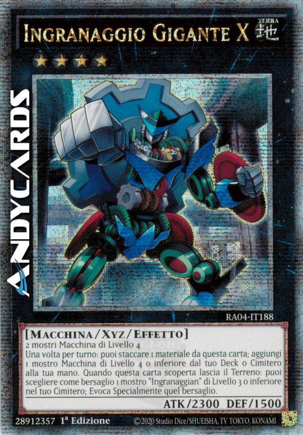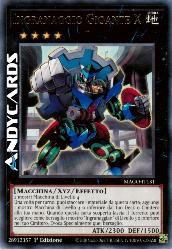 Una volta per turno: puoi staccare 1 Materiale Xyz da questa carta; aggiungi 1 mostro di Tipo Macchina di Livello 4 o inferiore dal tuo Deck o Cimitero alla tua mano. Quando questa carta lascia il Terreno: puoi scegliere come bersaglio 1 mostro "Ingranaggian" di Livello 3 o inferiore nel tuo Cimitero; Evoca Specialmente quel bersaglio.