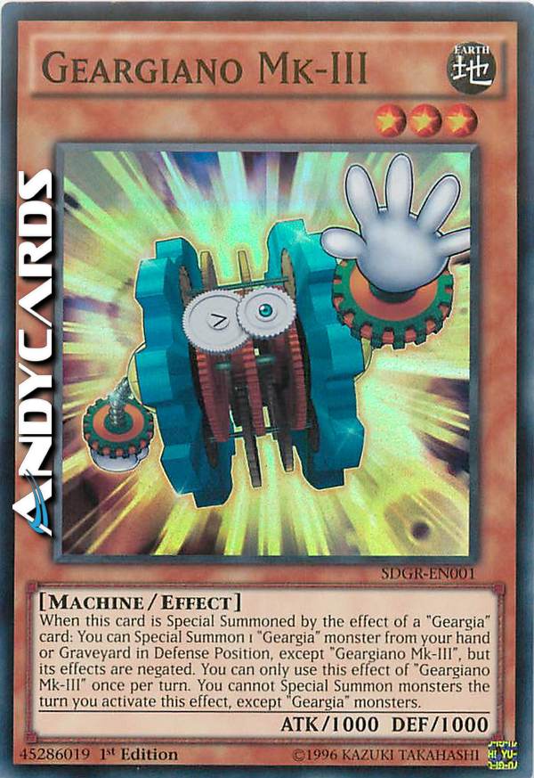 Quando questa carta viene Evocata Specialmente dall'effetto di una carta "ingranaggian": puoi Evocare Specialmente 1 mostro "Ingranaggian" dalla tua mano o Cimitero in Posizione di Difesa, eccetto "Ingranaggiano MK-III", ma i suoi effetti sono annullati. Puoi utilizzare questo effetto di "Ingranaggiano MK-III" una sola volta per turno. Non puoi Evocare Specialmente mostri nel turno in cui attivi questo effetto, eccetto mostri "ingranaggian".
