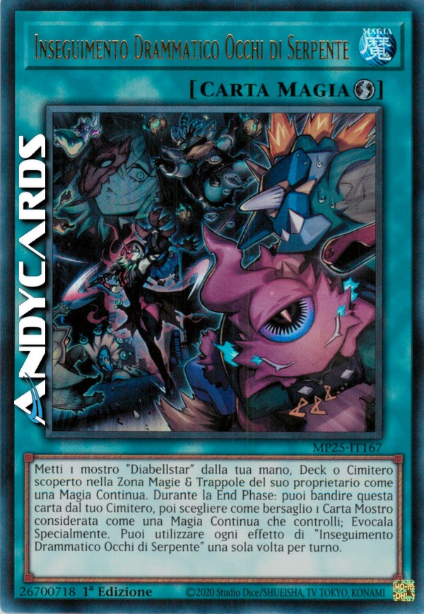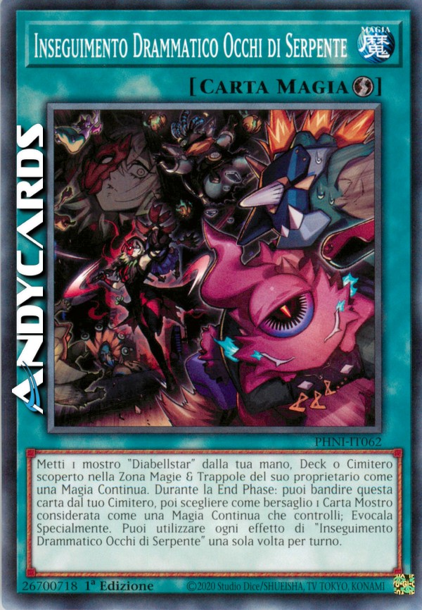 Metti 1 mostro "Diabellstar" dalla tua mano, Deck o Cimitero scoperto nella Zona Magie & Trappole del suo proprietario come una Magia Continua. Durante la End Phase: puoi bandire questa carta dal tuo Cimitero, poi scegliere come bersaglio 1 Carta Mostro considerata come una Magia Continua che controlli; Evocala Specialmente. Puoi utilizzare ogni effetto di "Inseguimento Drammatico Occhi di Serpente" una sola volta per turno.