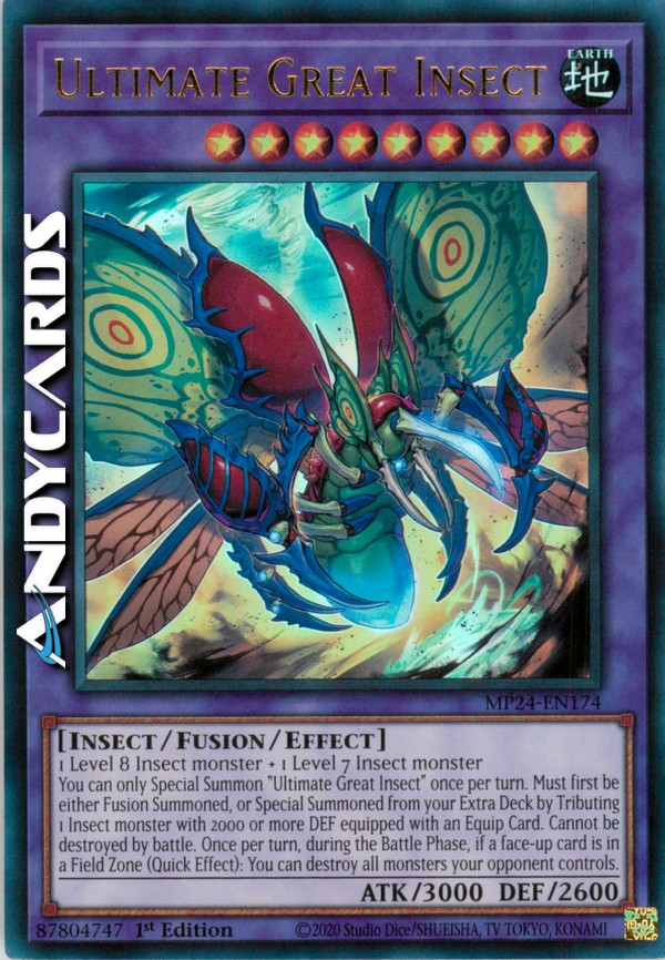 You can only Special Summon "Ultimate Great Insect" once per turn. Must first be either Fusion Summoned, or Special Summoned from your Extra Deck by Tributing 1 Insect monster with 2000 or more DEF equipped with an Equip Card. Cannot be destroyed by battle. Once per turn, during the Battle Phase, if a face-up card is in a Field Zone (Quick Effect): You can destroy all monsters your opponent controls.