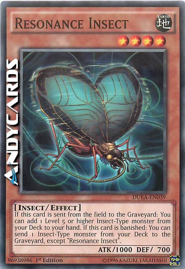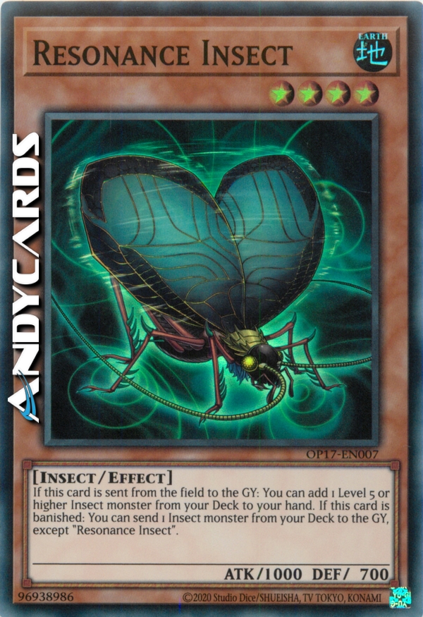 If this card is sent from the field to the GY: You can add 1 Level 5 or higher Insect monster from your Deck to your hand. If this card is banished: You can send 1 Insect monster from your Deck to the GY, except "Resonance Insect".