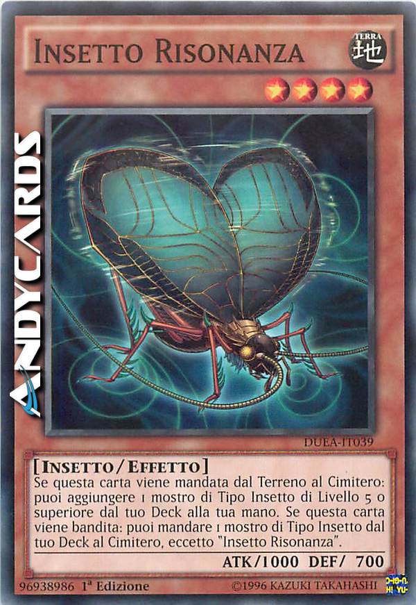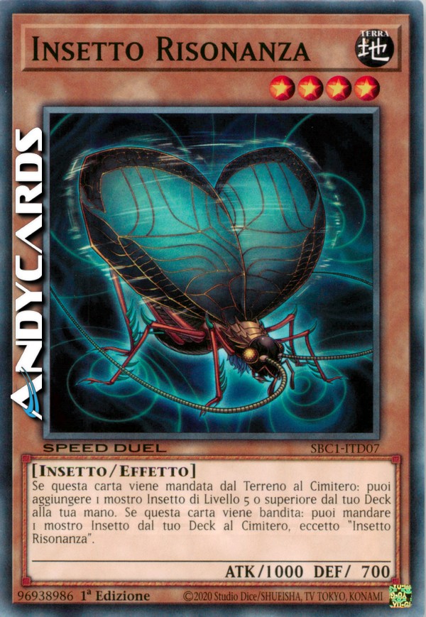 Se questa carta viene mandata dal Terreno al Cimitero: puoi aggiungere 1 mostro Insetto di Livello 5 o superiore dal tuo Deck alla tua mano. Se questa carta viene bandita: puoi mandare 1 mostro Insetto dal tuo Deck al Cimitero, eccetto "Insetto Risonanza".