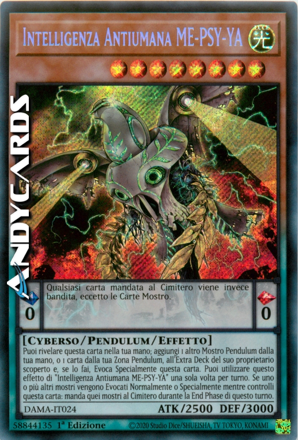 Puoi rivelare questa carta nella tua mano; aggiungi 1 altro Mostro Pendulum dalla tua mano, o 1 carta dalla tua Zona Pendulum, all'Extra Deck del suo proprietario scoperto e, se lo fai, Evoca Specialmente questa carta. Puoi utilizzare questo effetto di "Intelligenza Antiumana ME-PSY-YA" una sola volta per turno. Se uno o più altri mostri vengono Evocati Normalmente o Specialmente mentre controlli questa carta: manda quei mostri al Cimitero durante la End Phase di questo turno.