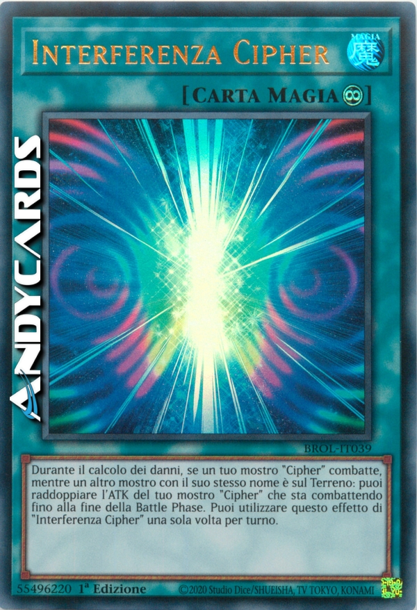 Durante il calcolo dei danni, se un tuo mostro "Cipher" combatte, mentre un altro mostro con il suo stesso nome è sul Terreno: puoi raddoppiare l'ATK del tuo mostro "Cipher" che sta combattendo fino alla fine della Battle Phase. Puoi utilizzare questo effetto di "Interferenza Cipher" una sola volta per turno.