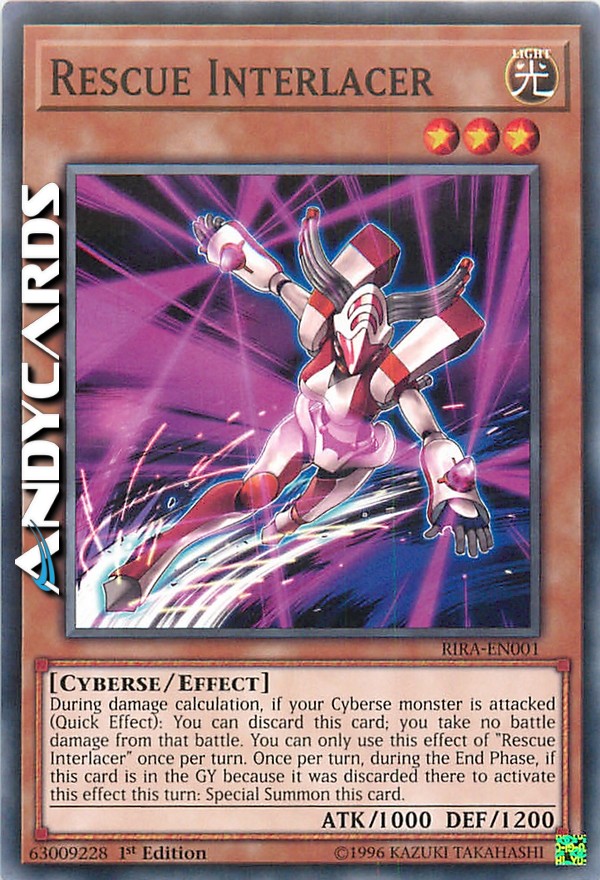 Durante il calcolo dei danni, se un tuo mostro Cyberso viene attaccato (Effetto Rapido): puoi scartare questa carta; non subisci danno da combattimento da quella battaglia. Puoi utilizzare questo effetto di "Interlacciatore da Soccorso" una sola volta per turno. Una volta per turno, durante la End Phase, se questa carta è nel Cimitero perché è stata scartata lì per attivare questo effetto in questo turno: Evoca Specialmente questa carta.